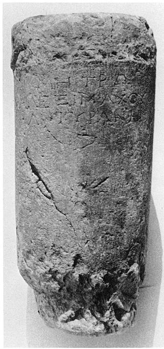 | Description: | Inscribed columnar grave monument. Ring chipped away; one side of top somewhat broken; otherwise complete. In the top, a small rough sinking. Hymettian marble. | |