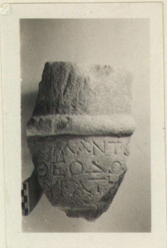 | Description: | Inscribed fragment of columnar grave monument. Top preserved; broken away at sides, at back and below. Fifteen letters remain. Pentelic marble. | |