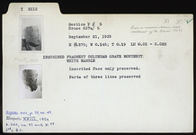 | Description: | Inscribed fragment of columnar grave monument. Inscribed face only preserved. Parts of three lines of the inscription preserved. White marble. | |