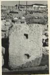 The block has clearly been re-used for there are two square dowel holes on the inscribed face. The right face has a recessed panel but no letters visible; a place where they might be expected. The left face has a moulding at bottom. The inscribed face is broken away at bottom edge so it is impossible to tell whether the moulding continued around it. The bottom has rough picked surface.