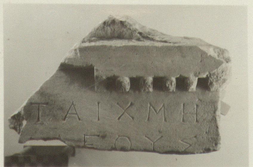 | Description: | Inscribed fragment of funeral monument. From small Doric architrave block; inscribed face and right side preserved. A regula with six guttae, is carried round onto the right face where three guttae remain. Inscribed on the face of the architrave. Eleven letters remain. Pentelic marble. | |
