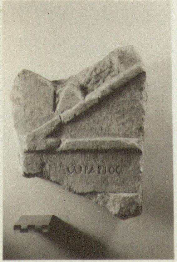 | Description: | Inscribed fragment of grave stele. From a pedimental stele; preserved close to the upper left corner. Back rough picked. Antefixial ornaments along the roughly finished top. Below the inscription a projecting moulding, broken away. Seven letters remain. Pentelic marble. | |