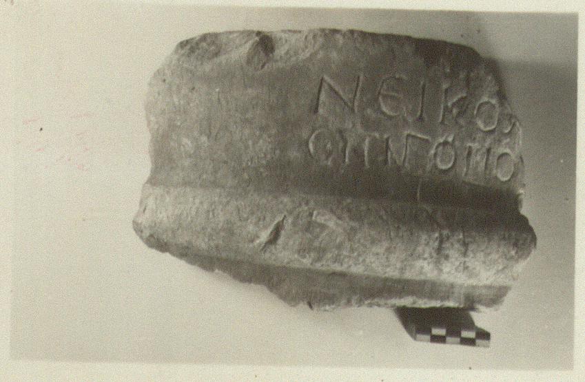 | Description: | Inscribed fragment of columnar grave monument. Top preserved. Inscription above fillet. Pentelic marble. | |