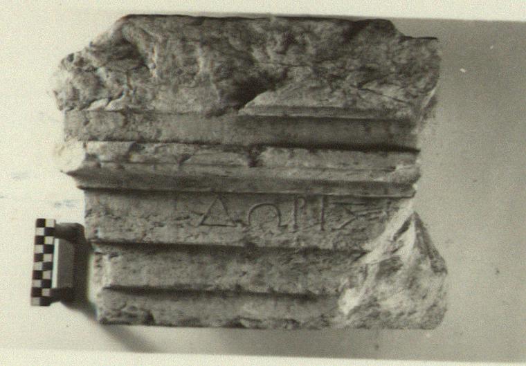 | Description: | Inscribed fragment of small grave monument. Block has original surface at top, back, front and left; broken at right. Above a small architrave of three fasciae, the upper one of which is inscribed, there is a crowning moulding of which the face is broken away. On the top surface a small dowel hole and a large cutting part of which is broken away at the right. The back has a polished surface at the right, at left a rough picked surface, 0.20m. wide and 0.035m. deep. One line of the inscription preserved. Pentelic marble. | |