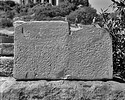 Both sides and bottom preserved and part of top. It has the rolled edge preserved on the left side. On the right the top of the stone has been cut off. The face and sides show pick marks and anathyrosis, the face being no smoother, altough the part where the letters are, is less rough.