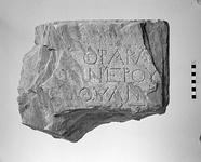 | Description: | Fragment from upper right hand corner of inscribed block. Right side worked smooth, and rough picked top preserved. Around the inscribed surface a narrow border. Dedication to Trajan. The end of three lines of the inscription preserved, and of the top part of a fourth. Hymettian marble. | |