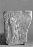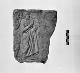 | Description: | Fragment of small votive stele with relief and inscription. Front, back, top and left surfaces preserved. The back and side rough dressed; the top smooth. Broken at right and at bottom, but the bottom of the relief preserved. The left half of a small votive stele with two standing figures in low relief at left, facing right: a bearded man, semidraped in an himation, and be, and behind him a woman cloaked and veiled. Beside them, the inscription; dedication to Zeus Meilichos. Four lines of the inscription preserved. Pentelic marble. | |