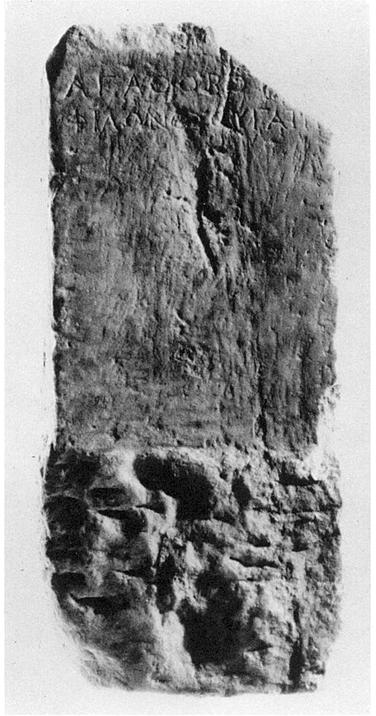 | Description: | Full dimension preserved; corners and edges somewhat broken. Front and back surfaces smooth, sides and top less so. The lower part, to a height of ca. 0.20m. is wider and thicker than the top, and is left rough for setting in the ground. Inscribed across the top in shallow letters of uneven height. Pentelic marble. | |