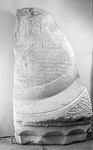 Part of two columns of inscription remain, with relief crown above preserved part of column I, and to left of column II. Surface badly worn.