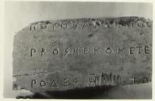 | Description: | Inscribed fragments. Property of Athena (?). Fragment ΝΝ 593 a), inscribed face, left face, and back preserved; broken at right, top, and bottom. The back surface is in two plains, the lower part rough picked, the upper polished, projecting. There is also a narrow projecting band along the front edge of the left face. Attic alphabet, archaistic. Three lines of the inscription preserved. Fragment Υ 24 b), smoothed back preserved; otherwise broken. Two lines of the inscription preserved. Pentelic marble. | |