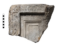 At left, a panel with a coarse ivy leaf. In the center is carved a door. Along the top of the stele, inscription in two lines.