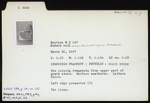 | Description: | Inscribed fragment. Two joining fragments from upper part of grave stele. Left edge preserved (?). Surface weathered. Letters faint. Two lines of the inscription preserved. Pentelic marble. | |