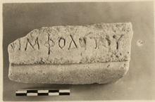 | Description: | Inscribed fragment. Broken all around. The inscription on a plain moulding; above a flattened ovolo. One line of the inscription preserved. Pentelic marble. | |