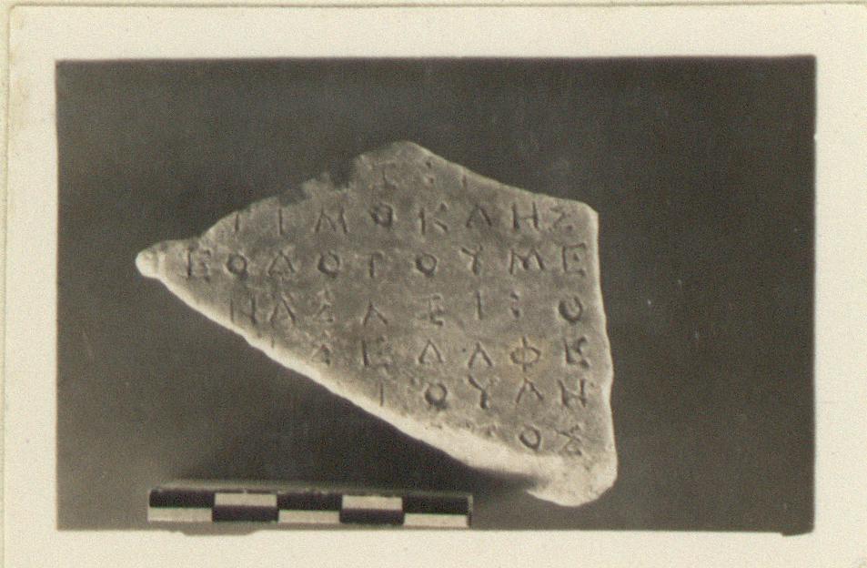 | Description: | Inscribed fragment. Inscribed face only preserved. "POLEITA" account; Laurion mines. Seven lines of the inscription preserved. Hymettian marble. | |