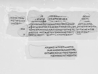 | Description: | Inscribed fragment. Smooth left side and smooth back preserved. Part of a large block roughly cut in the form of a slab to serve as a threshold. Imperial letter. Four lines of the inscription preserved. Pentelic marble. ADDENDA With IG II2, no. 1104. | |