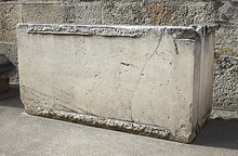 | Description: | Inscribed base. The full height and width of the block appear to be preserved; mouldings along top and bottom; both much battered. Six lines of the inscription preserved. Pentelic marble. | |
