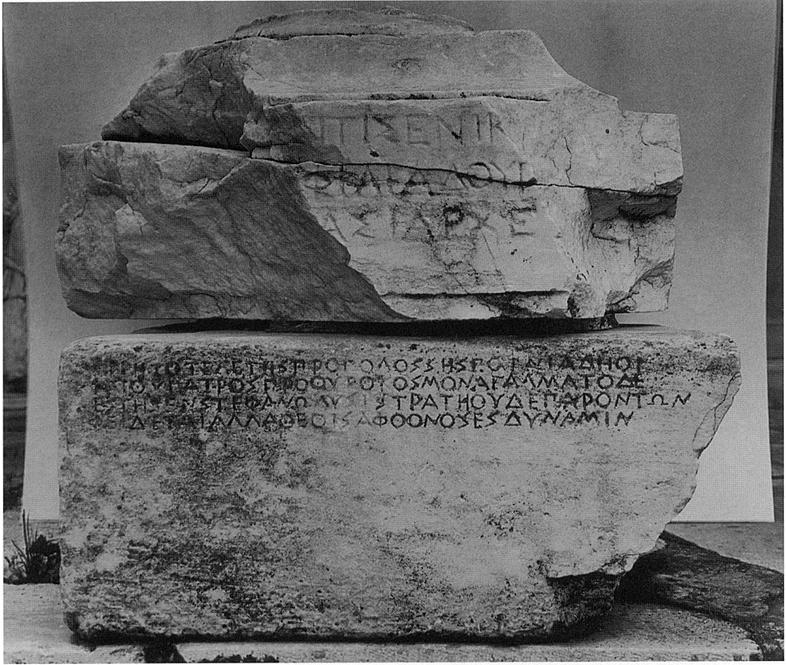 | Description: | Inscribed base. Broken off at right. All faces preserved smoothly dressed. A large rectangular cutting in the top, rough picked inside. Archaistic dedication in elegiacs to Deo by her attendant, Lysistrata. Four lines of the inscription preserved. Pentelic marble. | |