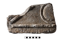 | Description: | Inscribed fragment. Left side of pediment preserved with disk ornament. Back deeply picked. One line of the inscription preserved. Pentelic marble. | |