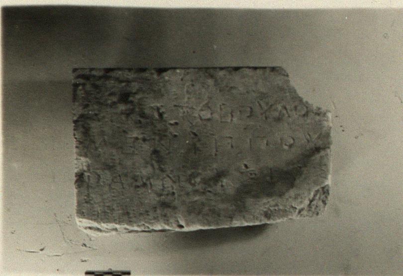 | Description: | Inscribed fragment. From a thin grave stone with pough picked back; broken away at bottom. Inscription complete. Three lines of the inscription preserved. Hymettian marble. | |