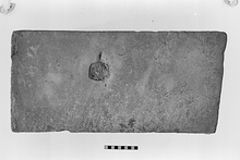 Bottom and top are probably the original surfaces; bit of original right edge preserved at front of right side. Rough re-cuttings at left and back.