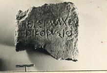 | Description: | Inscribed fragment. Broken below, all other roughly finished surfaces preserved at least in part. Two lines of the inscription preserved. Hymettian (?) marble. The stone, if Hymettian, is almost a schist. | |