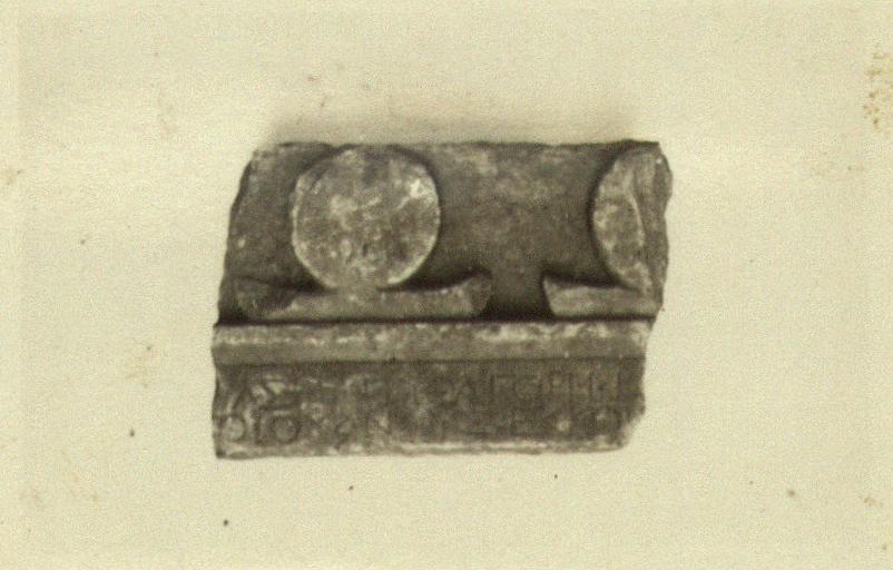 | Description: | Inscribed fragment from the top of a large stele or monument (?). Top rough picked; bottom hacked away, behind a beveled front edge; sides and back broken. Inscribed in two lines, below a decorated band. Pentelic marble. | |