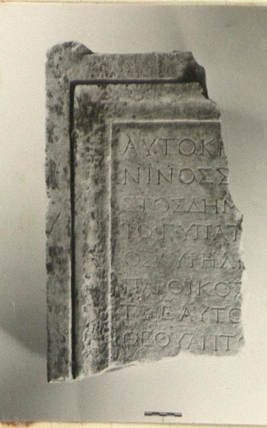 | Description: | Inscribed fragment. Upper left corner of thin stele with moulded border; left edge only of pedimental top preserved. Smooth back, rough picked left edge. Heading of Imperial Letter (?) of year 165, year in which Marcus Aurelius was imperor for third time (fourth time in next year 166) and Lucius Verus heald the tribune post for fifth time (lines 4 and 7) and received the title of Patrickios. In line 5, Lucius Verus showed also have the title "αρχιερευς μεγιστος". Pentelic marble. ADDENDA Joins to I 7173. Taken to the Epigraphical Museum on January 1971 and compared to EM 8402; does not belong. | |