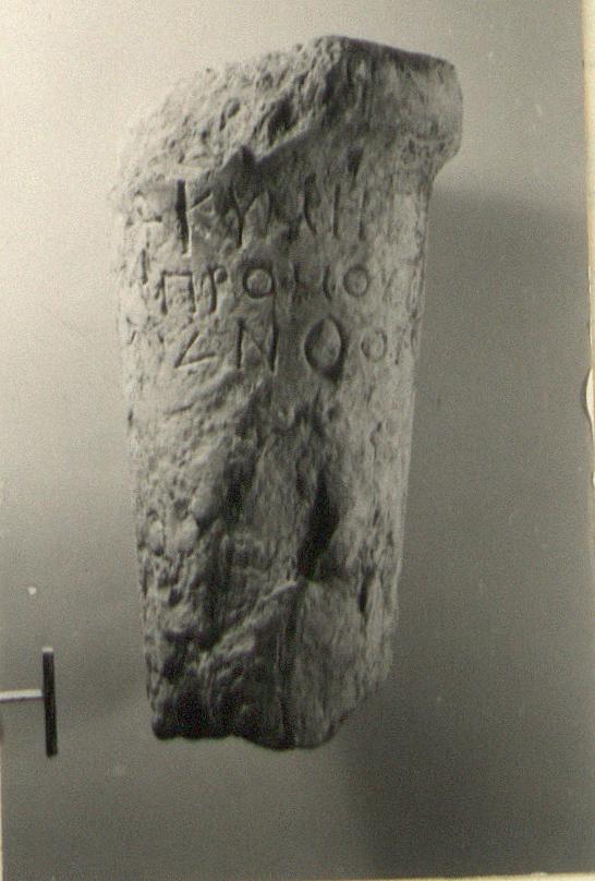 | Description: | Inscribed fragment of columnar grave monument. Much battered and streaked marble. | |