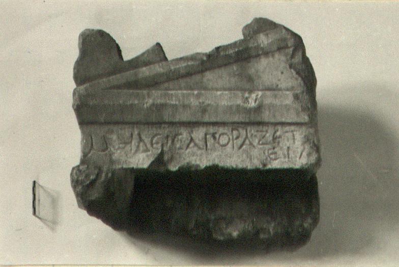 | Description: | Inscribed fragment of upper left hand corner of naiskos. The piece is preserved from the entablature on up, with the entire left corner acroterion and a bit of the top one. After the first letter the surface is cut down somewhat and the inscription continues in what seems to be the same hand. The side is well worked, the back very rough. Pentelic marble. | |