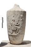 | Description: | Inscribed lekythos. Neck and handle broken off. Foot missing. In relief four figures. Seated woman shakes hands with standing woman. Between them a baby. Behind standing woman a smaller standing female figure. White marble. | |