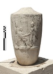 | Description: | Inscribed lekythos. Neck and handles missing. Dowel hole for attaching neck. Foot missing. In relief three figures. Standing woman behind seated man who shakes hands with standing man. Above the last, traces of letters. White marble. | |