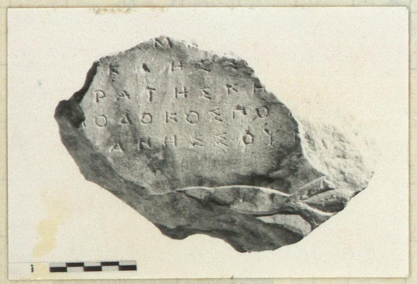 | Description: | Inscribed fragment. Broken on all sides and back. Below names is top of carved wreath. Blue Hymettian marble. ADDENDA With I 7201. | |