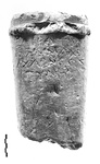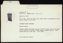 | Description: | Inscribed fragment of columnar grave monument. Broken at bottom. Roughly marked circular cutting on top placed off center column tapers toward bottom. Half round near top, much worn. Blue Hymettian marble. | |