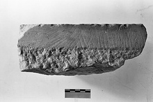 Anathyroses on right side as though of an architectural block. Lower face of inscription has chisel marks worked down (?).
