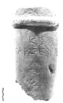 | Description: | Inscribed fragment of columnar grave monument. Broken on back and bottom. Below top have half round 0.03m. in height going around circumference of column. Two lines of the inscription preserved; inscription complete 0.04m. Gray-blue marble. | |
