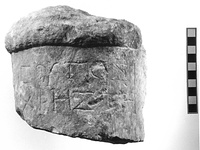 Front half of the top of a columnar grave monument preserved, most of top surface broken away.