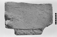 | Description: | Inscribed fragment. Broken at top, chips off bottom. Front smooth; inscription on top; row of three wreaths below. On side very smooth; other side left rough picked. Back and bottom very rough. On bottom a tenon; bottom of tenon very smooth. Blue Hymettian marble. | |