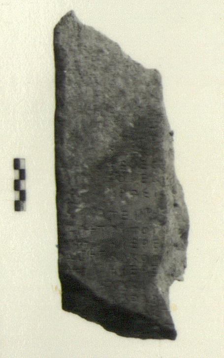 | Description: | Inscribed fragment. One side preserved, broken above, below and other side. Anathyrosis on side, text on both faces. Room for up to twenty-two lines of text, ca. nineteen have one letter or more, both faces and side heavily worn from reuse in drain; opisthographic. Fragment of the law code of Nikomachos; sacred calendar, both sides. Pentelic marble. Cf. I 727 and other pieces. | |
