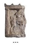 | Description: | Broken in half along height. Relief extremely worn and encrusted. The relief depicts a horse (head and neck missing) and its rider within an architectural frame consisting of square pier and tiled roof with antefixes. On the architrave, part of an inscription: ΑΠΟΛΛΟ Back and underside roughly picked. Inscribed fragment of stele, with relief. Very sugary white marble. | |