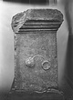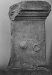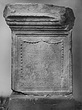 | Description: | Large inscribed base of grave monument. Dimensions preserved complete, though at the bottom the projecting base-moulding has been broken away, and the under surface is preserved only near the middle of the block. At the top, the corner ornaments are chipped, and the front right corner is broken away. Top surface rough picked, with a large shallow round cutting in the center. Back plain, picked fairly fine. Sides dressed with toothed chisel; on the left, a thin flat oval pendant in relief (tambourine?), projection ca. 0.012m; on each side of it, and below, an ivy leaf in low relief. On the right side, a pair of castanets (?). The inscription given both in Greek and in Latin. The inscribed face, below the heavy crowning which is carried round all four sides of the block, is framed with a shallow cymation; the mouldings finished smooth; the face more roughly, with a toothed chisel. Above the moulding, the upper 0.105m. of the block is cut ca. 0.022m. and roughly dressed. Pentelic marble. | |