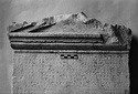 | Description: | Inscribed stele. The left side is worked with a claw against the pediment (the akroteria of which are chopped back) and four flutings divided by fillets, with a rectangle at the bottom enclosing three dots. Rough picked behind and beneath. Decree honoring Prytanis, the Peripatetic Philosopher. Fifty-one lines of the inscription preserved; at the bottom a wreath with radiating leaves enclosing three more lines. Pentelic marble. | |