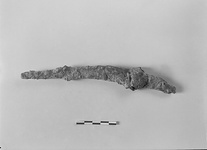 | Description: | Mended from four pieces; the point broken off. Straight blade, triangular in section, with one sharp edge; one end pointed; the blade widening to the shaft which curves slightly and is flat to fit into the handle. | |