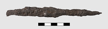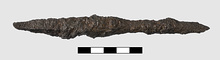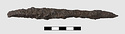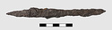 Long, thin and straight. Apparently pointed at one end (for driving into wooden shaft ?). Near other end, section appears to be square, tapering down to a boat-shaped chisel end. Cutting edge possibly rounded.