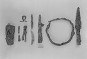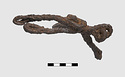 | Description: | Preserved complete in five joining fragments. (Three fragments, one corroded against part of a second bit-shaped object, IL 1066, and one corroded against light spearhead IL 1059). Composed of two sections, equal in length, the whole resembling in shape a snaffle bit. Sections are joined by interlocking loops at one end; the other end of each section is terminated in a free loop. Constructed from two interlocking strands of iron twisted to form shaft. Ends are tucked back to form free loops. See Nb. p. 2793 for details of construction and drawings. See IL 1066, for same object, slightly smaller in size. IL 1063 and IL 1066: 189.9gr | |