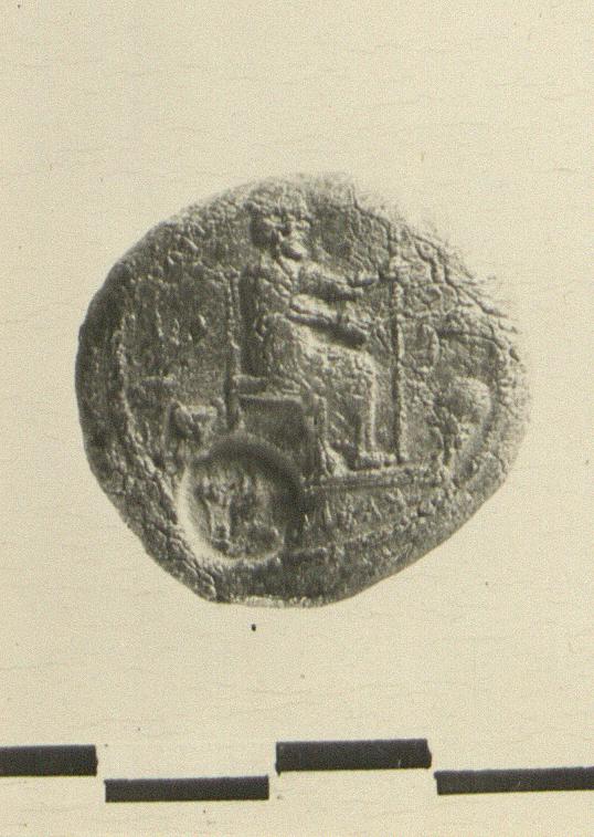 Description:   A: throned bearded draped Dionysos, right, with both arms held out in front, long staff in left hand, right hand unclear.