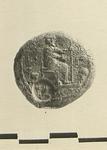 Traces of letters around edge and below ground line. All in circle of dots. One countermark of stork and lizard at lower left.