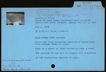 | Description: | First and best preserved section of water pipe from system found in place. Made of a sheet of lead folded to form a tube. The opening at one end is larger, for insertion of the connecting section of pipe. | |