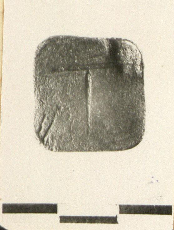 | Description: | Inscribed. Thin approximately square, with large letter T incised on one side. | |