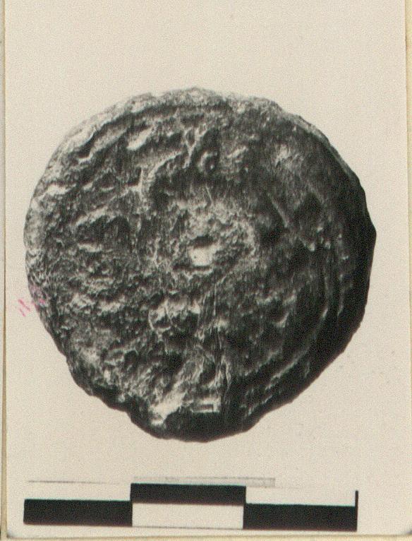 | Description: | Obverse: in relief, letter A and inset in low relief oval beside it, a winged caduceus. Reverse: very dull head of helmeted Athena. Cf. IL 57. | |