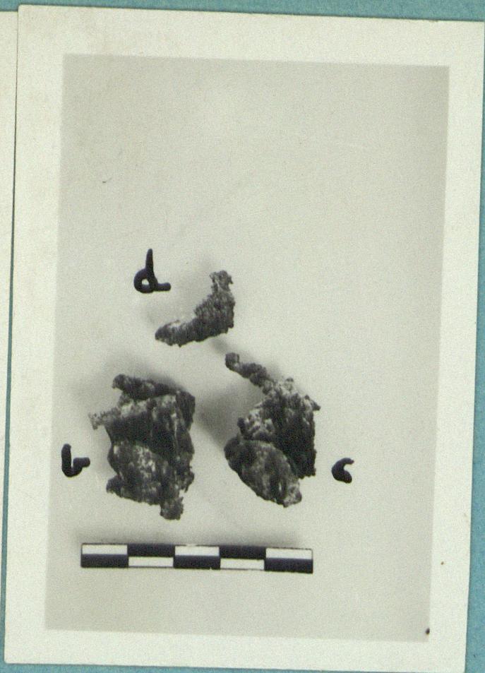 | Description: | a) is much corroded, but complete save for part of the pin. With it fragments of three others (b, c, d) much bent and corroded all of the same sort and size. | |